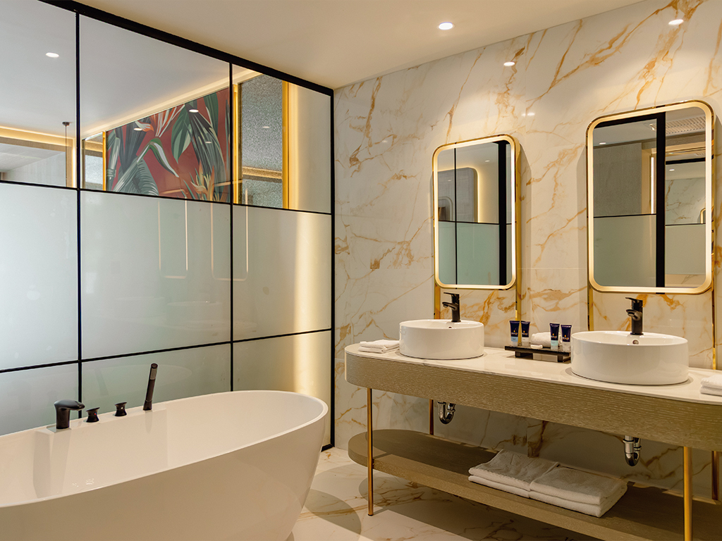 Ofrecemos 52 Deluxe Junior Suite Swimout con acceso directo a la piscina (mayores de 13 años). También están equipadas con baño completo con bañera y balcón o terraza. *Ocupación máxima: 3 personas (3 adultos de más de 13 años)